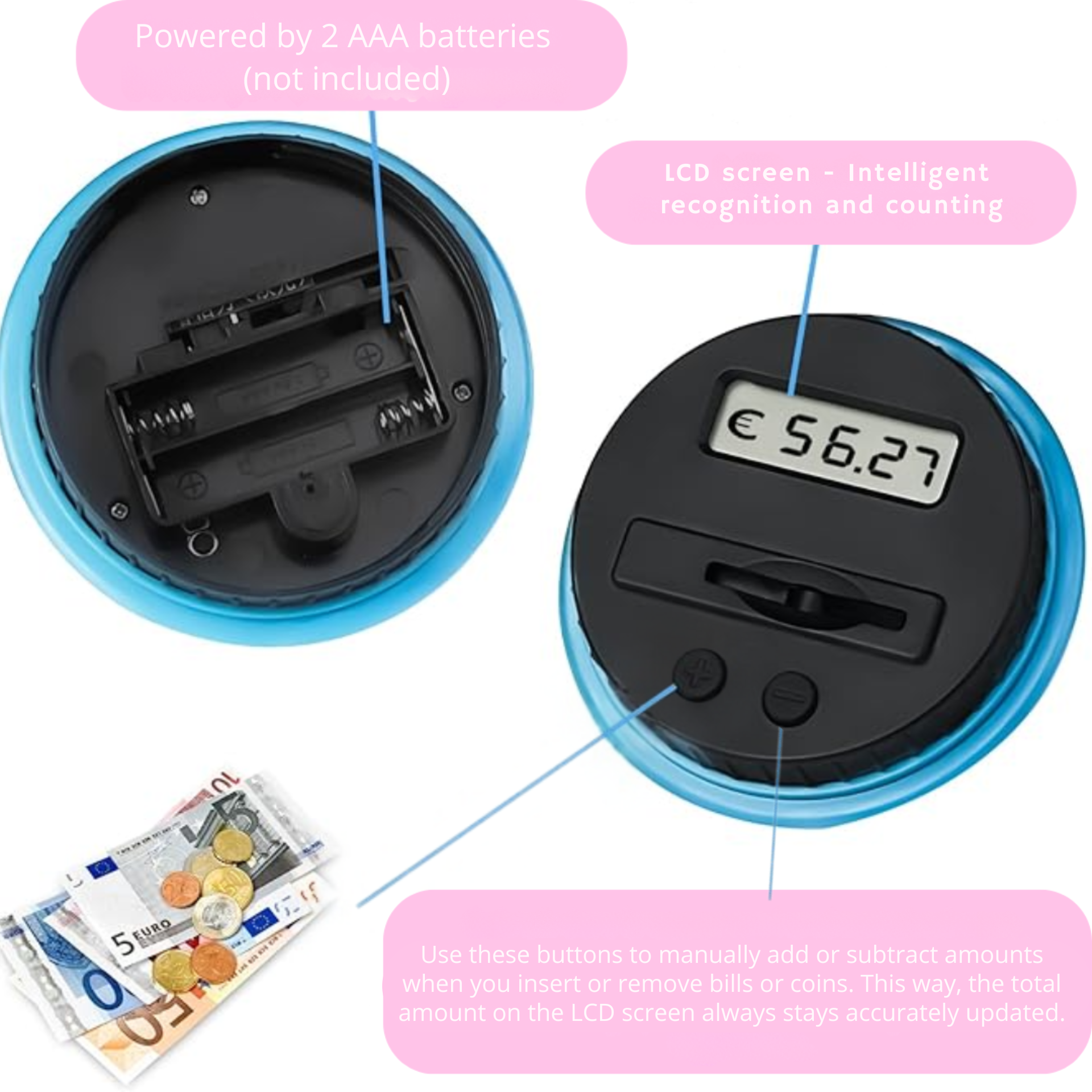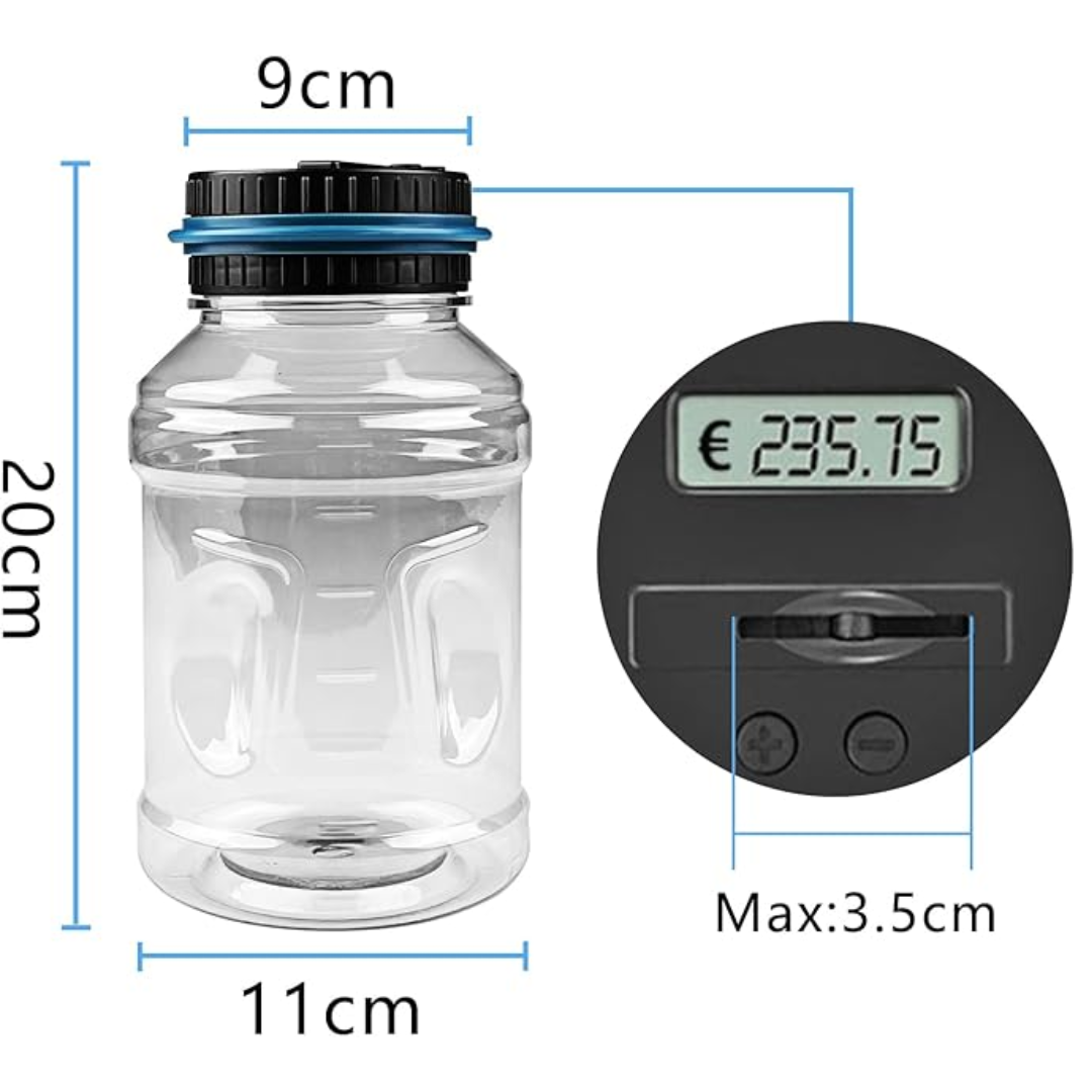 De digitale teller herkent iedere euro-munt en telt deze direct op bij je saldo. In één oogopslag zie je hoeveel je al hebt gespaard.